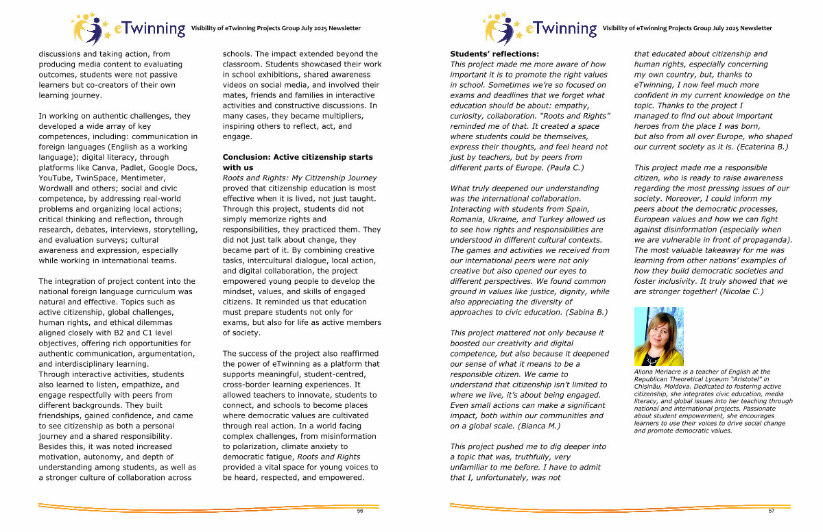 This project mattered not only because it boosted our creativity and digital competence, but also because it deepened our sense of what it means to be a responsible citizen. We came to understand that citizenship isn’ t limited to where we live, it’ s about being engaged. Even small actions can make a significant impact, both within our communities and on a global scale.( Bianca M.) that educated about citizenship and human rights, especially concerning my own country, but, thanks to eTwinning, I now feel much more confident in my current knowledge on the topic. Thanks to the project I managed to find out about important heroes from the place I was born, but also from all over Europe, who shaped our current society as it is.( Ecaterina B.)