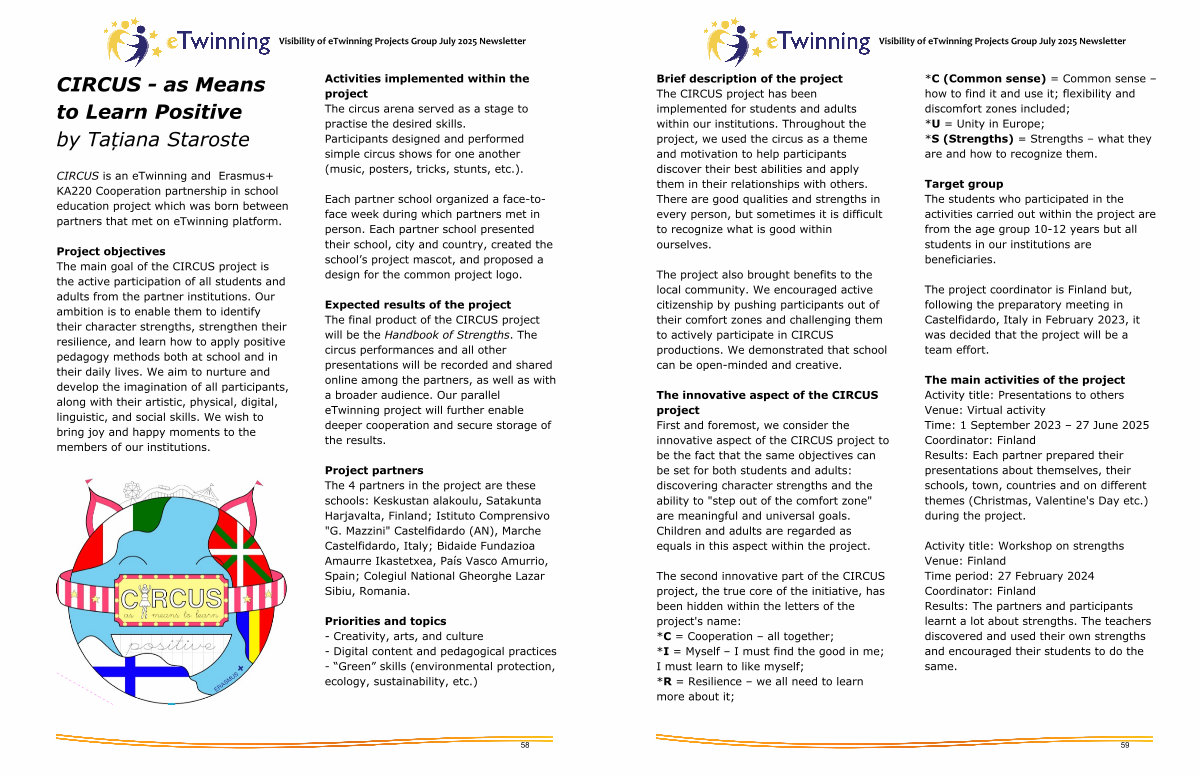 Project objectives The main goal of the CIRCUS project is the active participation of all students and adults from the partner institutions. Our ambition is to enable them to identify their character strengths, strengthen their resilience, and learn how to apply positive pedagogy methods both at school and in their daily lives. We aim to nurture and develop the imagination of all participants, along with their artistic, physical, digital, linguistic, and social skills. We wish to bring joy and happy moments to the members of our institutions.