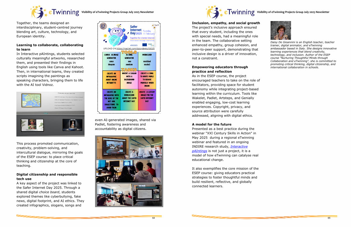 Learning to collaborate, collaborating to learn In Interactive pAIntings, students selected culturally meaningful artworks, researched them, and presented their findings in English using tools like Canva and Kahoot. Then, in international teams, they created scripts imagining the paintings as speaking characters, bringing them to life with the AI tool Vidnoz.