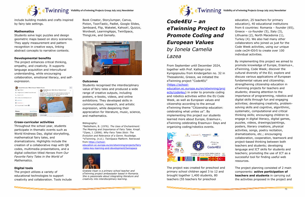 From September until December 2024, together with Prof. Kalliopi-Lina Kynigopoulou from Kindergarten no. 32 in Thessaloniki, Greece, we initiated the eTwinning project“ Code4EU”( https:// schooleducation. ec. europa. eu / en / etwinning / proj ects / code4eu) in order to promote coding and robotics activities within the EU Code Week, as well as European values and citizenship according to the annual eTwinning theme“ Citizenship education: celebrating what unites us”. By implementing this project our students learned more about Europe, Erasmus +, eTwinning celebrating Erasmus + Days and organizing coding / robotics events.