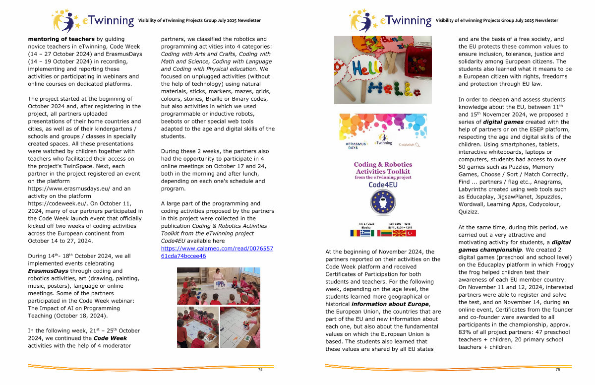 At the beginning of November 2024, the partners reported on their activities on the Code Week platform and received Certificates of Participation for both students and teachers. For the following week, depending on the age level, the students learned more geographical or historical information about Europe, the European Union, the countries that are part of the EU and new information about each one, but also about the fundamental values on which the European Union is based. The students also learned that these values are shared by all EU states