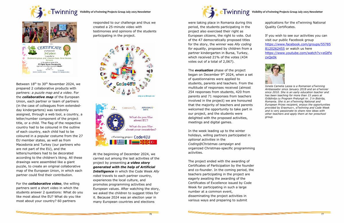 Visibility of eTwinning Projects Group July 2025 Newsletter were taking place in Romania during this period, the students participating in the project also exercised their right as European citizens, the right to vote. Out of the 47 democratically proposed titles for the story, the winner was Ally coding for equality, proposed by children from a partner kindergarten in Bursa, Turkey, which received 21 % of the votes( 434 votes out of a total of 2,067). applications for the eTwinning National Quality Certificates.