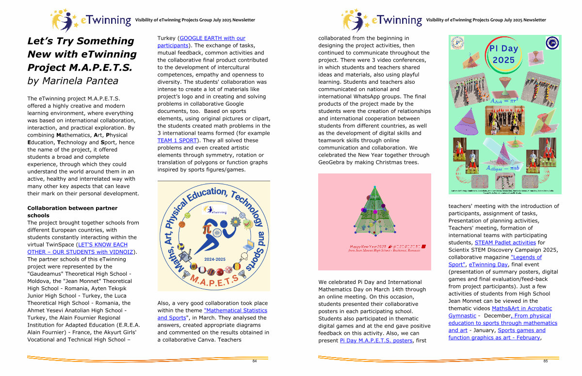 The eTwinning project M. A. P. E. T. S. offered a highly creative and modern learning environment, where everything was based on international collaboration, interaction, and practical exploration. By combining Mathematics, Art, Physical Education, Technology and Sport, hence the name of the project, it offered students a broad and complete experience, through which they could understand the world around them in an active, healthy and interrelated way with many other key aspects that can leave their mark on their personal development.