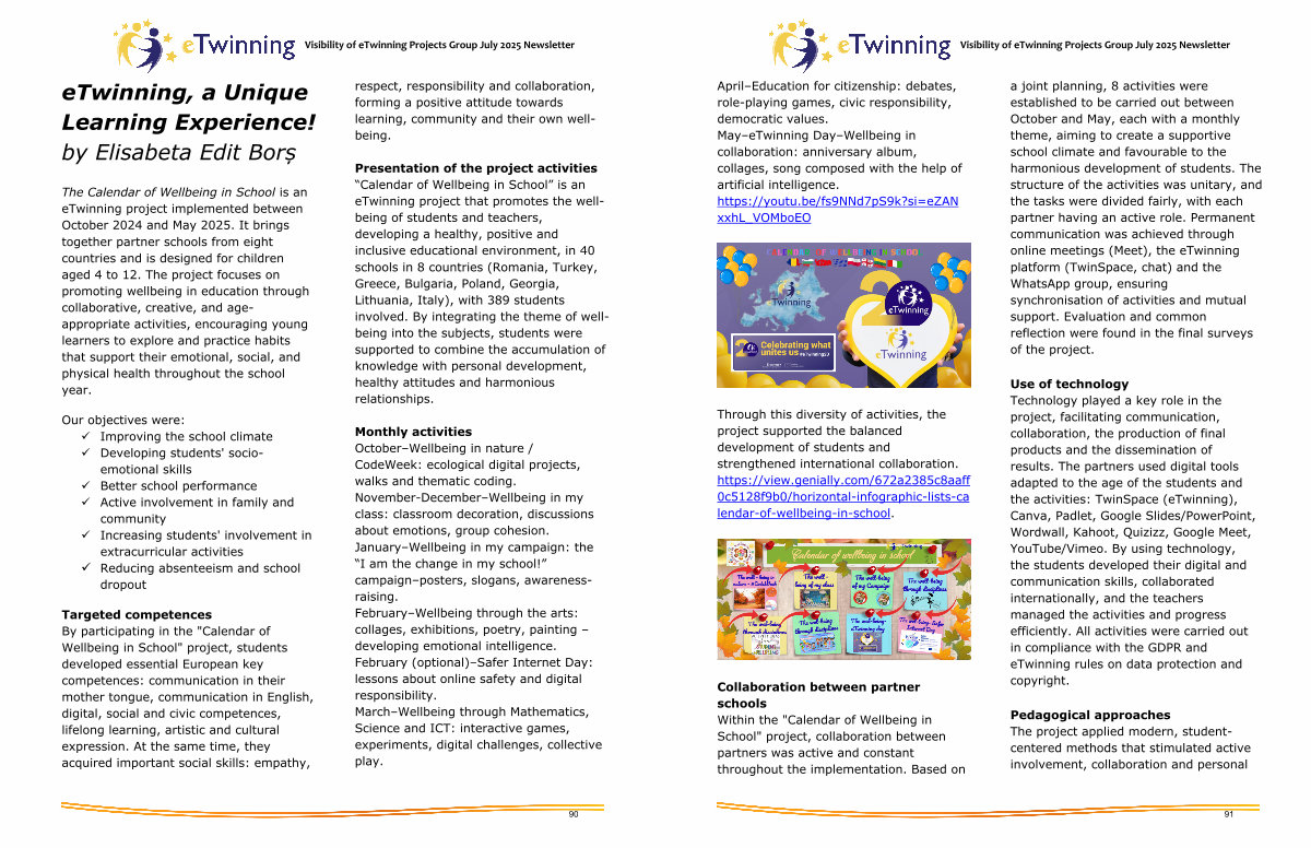 Presentation of the project activities“ Calendar of Wellbeing in School” is an eTwinning project that promotes the wellbeing of students and teachers, developing a healthy, positive and inclusive educational environment, in 40 schools in 8 countries( Romania, Turkey, Greece, Bulgaria, Poland, Georgia, Lithuania, Italy), with 389 students involved. By integrating the theme of wellbeing into the subjects, students were supported to combine the accumulation of knowledge with personal development, healthy attitudes and harmonious relationships.