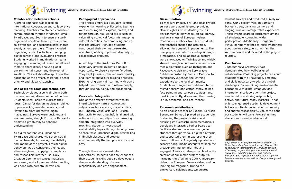 Personal contributions As an English teacher at İlkadım 23 Nisan Secondary School, I played an active role in shaping the project’ s vision and ensuring its successful implementation. I developed interactive Padlet boards to facilitate student collaboration, guided students through various digital platforms, and supported them in expressing their ideas confidently. I regularly updated our school’ s social media accounts to keep the broader community informed and engaged. I was also deeply involved in the creation of our major project outputs, including the eTwinning 20th Anniversary video, the European Values video, and our joint digital magazine. During the anniversary celebrations, we created