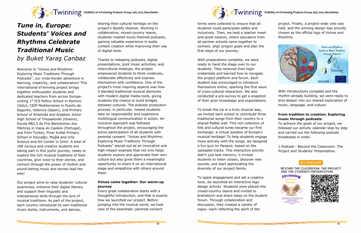 Welcome to " Voices and Rhythms: Exploring Music Traditions Through Podcasts ", our cross-border adventure in learning, creativity, and collaboration! This international eTwinning project brings together enthusiastic students and dedicated teachers from across Europeuniting 1 ° ICS Pellico School in Pachino( Italy), CEIP Mediterraneo in Puerto de Sagunto, Valencia( Spain), 2nd Primary School of Artemida and Arsakeio Junior High School of Thessaloniki( Greece), Escola EB2,3 de Frei Bartolomeu dos Mártires in Viana do Castelo( Portugal), and from Turkey, Pınar Kulfat Primary School in Köyceğiz, Muğla and Urla Science and Art Center in İzmir. A total of 186 curious and creative students are taking part in this joyful journey, ready to explore the rich musical traditions of their countries, give voice to their stories, and connect through the power of rhythm and sound-letting music and stories lead the way!