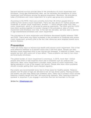 The global burden of vision impairment is enormous . In 2010 , more than 1 bil lion people were blind or had impaired vision due to diseases such as cataract and glaucoma . Near vision impairment is another major cause of vision impairment . The aging population is one of the largest risk factors . People who have vision problems should consider getting their eyes checked regularly .