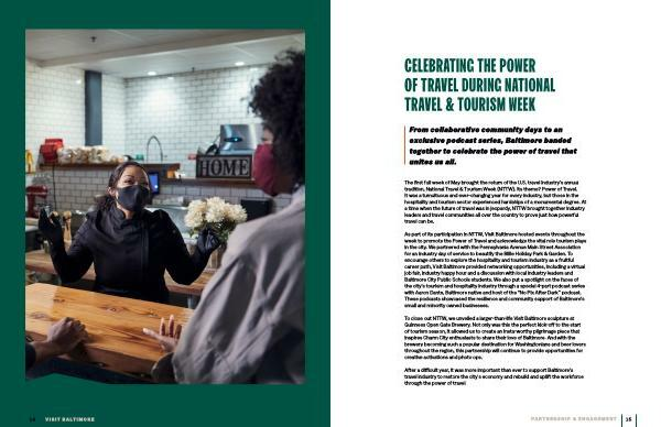 As part of its participation in NTTW , Visit Baltimore hosted events throughout the week to promote the Power of Travel and acknowledge the vital role tourism plays in the city . We partnered with the Pennsylvania Avenue Main Street Association for an industry day of service to beautify the Billie Holiday Park & Garden . To encourage others to explore the hospitality and tourism industry as a fruitful career path , Visit Baltimore provided networking opportunities , including a virtual job fair , industry happy hour and a discussion with local industry leaders and Baltimore City Public Schools students . We also put a spotlight on the faces of the city ’ s tourism and hospitality industry through a special 4-part podcast series with Aaron Dante , Baltimore native and host of the “ No Pix After Dark ’’ podcast . These podcasts showcased the resilience and community support of Baltimore ’ s small and minority owned businesses .