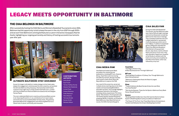 As a result of this press trip, we earned multiple stories reaching close to 16 million readers and representing $ 150,000 in equivalent ad value. The coverage highlights businesses featured in the itinerary, including culinary experiences( The Urban Oyster, Yebo Kitchen, The Empanada Lady, The Garden Rooftop, Rooted Rotisserie), shopping( MESS in a Bottle), art( Creatively Black Baltimore, Dear Black Girl) and, of course, the CIAA championship game.