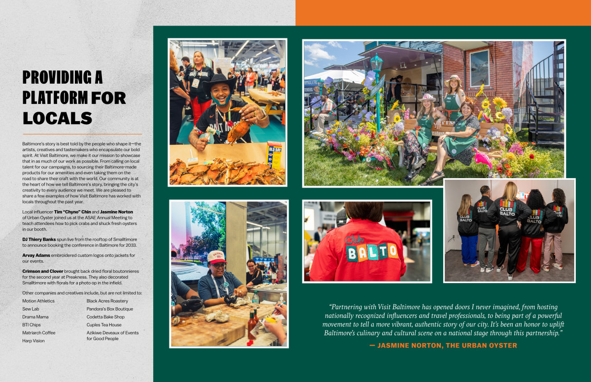 “ Partnering with Visit Baltimore has opened doors I never imagined, from hosting nationally recognized influencers and travel professionals, to being part of a powerful movement to tell a more vibrant, authentic story of our city. It’ s been an honor to uplift Baltimore’ s culinary and cultural scene on a national stage through this partnership.”