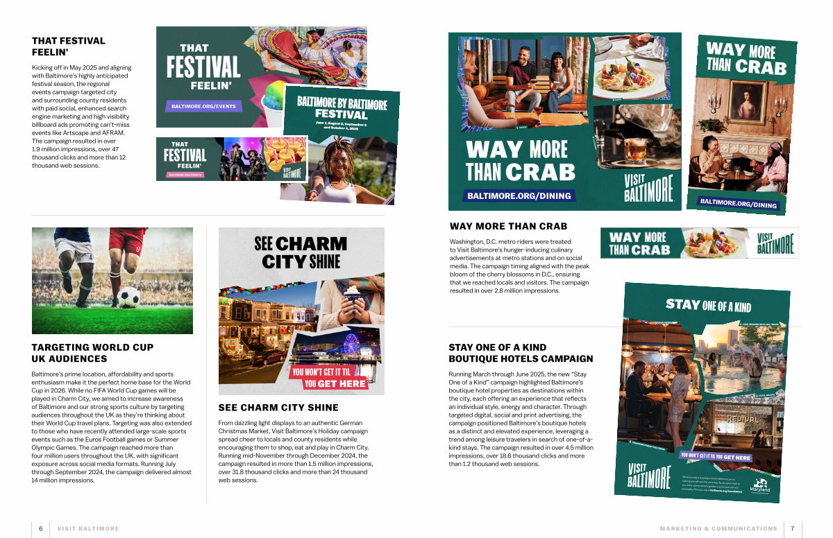 Running March through June 2025, the new“ Stay One of a Kind” campaign highlighted Baltimore’ s boutique hotel properties as destinations within the city, each offering an experience that reflects an individual style, energy and character. Through targeted digital, social and print advertising, the campaign positioned Baltimore’ s boutique hotels as a distinct and elevated experience, leveraging a trend among leisure travelers in search of one-of-akind stays. The campaign resulted in over 4.5 million impressions, over 18.6 thousand clicks and more than 1.2 thousand web sessions.