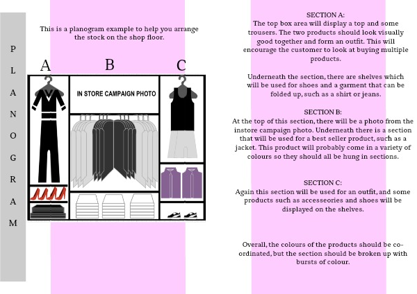 At the top of this section, there will be a photo from the instore campaign photo. Underneath there is a section that will be used for a best seller product, such as a jacket. This product will probably come in a variety of colours so they should all be hung in sections.