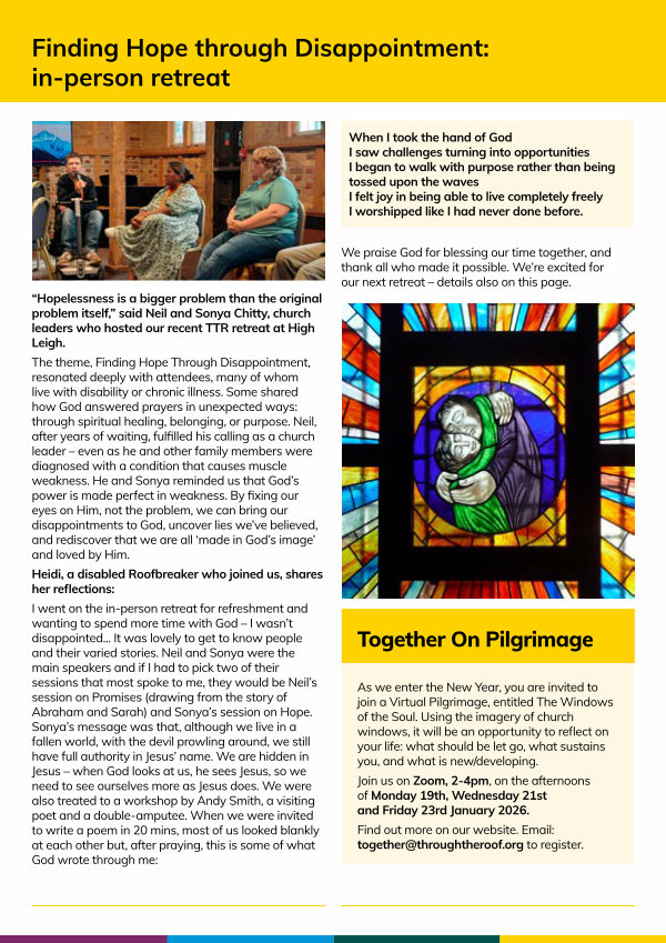 The theme, Finding Hope Through Disappointment, resonated deeply with attendees, many of whom live with disability or chronic illness. Some shared how God answered prayers in unexpected ways: through spiritual healing, belonging, or purpose. Neil, after years of waiting, fulfilled his calling as a church leader – even as he and other family members were diagnosed with a condition that causes muscle weakness. He and Sonya reminded us that God’ s power is made perfect in weakness. By fixing our eyes on Him, not the problem, we can bring our disappointments to God, uncover lies we’ ve believed, and rediscover that we are all‘ made in God’ s image’ and loved by Him.
