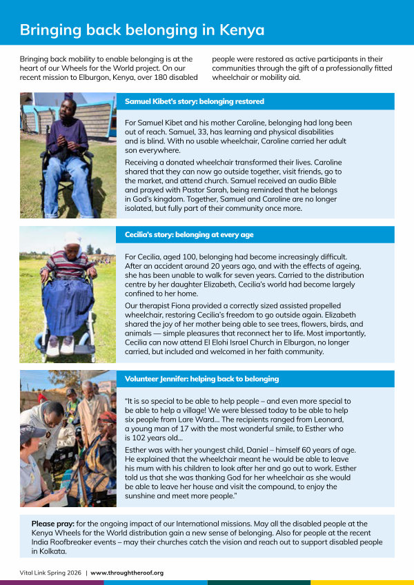 Please pray: for the ongoing impact of our International missions. May all the disabled people at the Kenya Wheels for the World distribution gain a new sense of belonging. Also for people at the recent India Roofbreaker events – may their churches catch the vision and reach out to support disabled people in Kolkata.