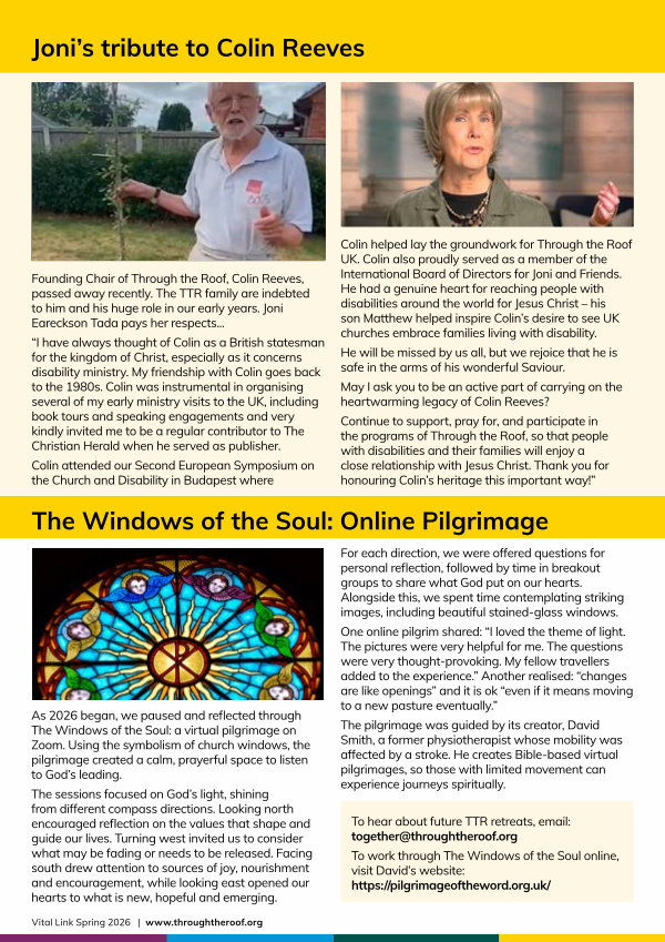 Colin helped lay the groundwork for Through the Roof UK. Colin also proudly served as a member of the International Board of Directors for Joni and Friends. He had a genuine heart for reaching people with disabilities around the world for Jesus Christ – his son Matthew helped inspire Colin’ s desire to see UK churches embrace families living with disability.
