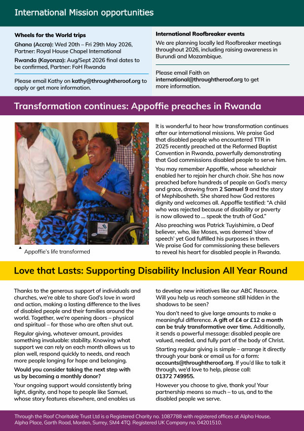 It is wonderful to hear how transformation continues after our international missions. We praise God that disabled people who encountered TTR in 2025 recently preached at the Reformed Baptist Convention in Rwanda, powerfully demonstrating that God commissions disabled people to serve him.