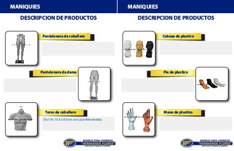 MANIQUIES DESCRIPCION DE PRODUCTOS Pantalonera de caballero Pantalonera de dama Torso de caballero De 19 x 13.5 x 9.5 cm con 2 portamonedas.