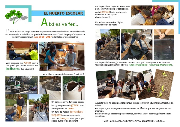 L' hort escolar va sorgir com una resposta educativa enriquidora que volia oferir als alumnes la possibilitat de gaudir del contacte amb l’hort. Un grup d’alumnes va iniciar l’experiència el curs 2016- 2017 orientats per dues mestres.