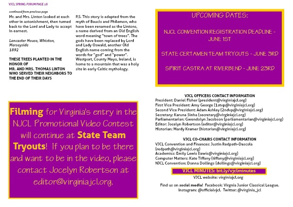 Filming for Virginia's entry in the NJCL Promotional Video Contest will continue at State Team Tryouts! If you plan to be there and want to be in the video, please contact Jocelyn Robertson at editor@virginiajcl.org.