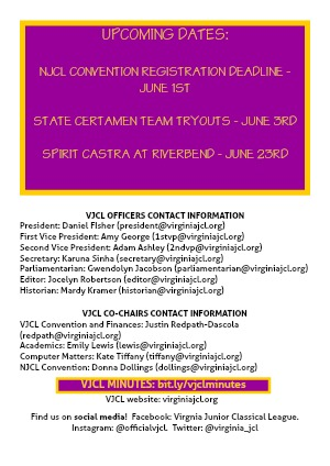 Find us on social media! Facebook: Virgnia Junior Classical League. Instagram: @officialvjcl. Twitter: @virginia_jcl