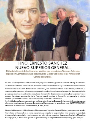 Damos la bienvenida al Hno. Ernesto Sánchez nuevo Superior General Marista, mexicano con mucha trayectoria profesional en la rama, su carisma y empatía le ha permitido vivir en sana comunidad, fomentar la fraternidad, y continuar con los principios y objetivos de nuestro fundador Marcelino Champagnat, le deseamos que en su gestión Dios y la Virgen María le acompañe y guíe siempre.
