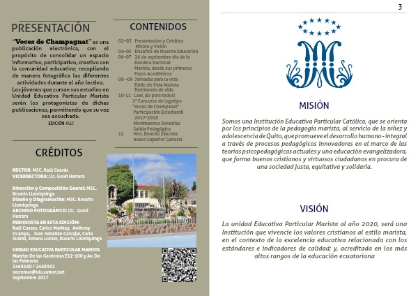Somos una Institución Educativa Particular Católica, que se orienta por los principios de la pedagogía marista, al servicio de la niñez y adolescencia de Quito, que promueve el desarrollo humano - integral a través de procesos pedagógicos innovadores en el marco de las teorías psicopedagógicas actuales y una educación evangelizadora, que forma buenos cristianos y virtuosos ciudadanos en procura de una sociedad justa, equitativa y solidaria.