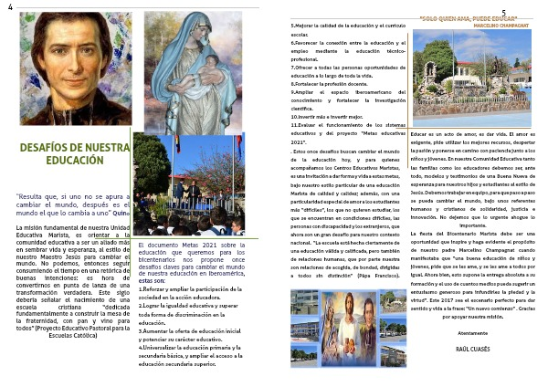 La fiesta del Bicentenario Marista debe ser una oportunidad que inspire y haga evidente el propósito de nuestro padre Marcelino Champagnat cuando manifestaba que “una buena educación de niños y jóvenes, pide que se les ame, y se les ame a todos por igual. Ahora bien, esto supone la entrega absoluta a su formación y el uso de cuantos medios pueda sugerir un entusiasmo generoso para infundirles la piedad y la virtud”. Este 2017 sea el escenario perfecto para dar sentido y vida a la frase: “Un nuevo comienzo” . Gracias por apoyar nuestra misión.
