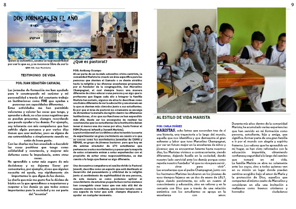 Uno de nuestros compañeros el cual ha vivido la Pastoral juvenil, describe como un espacio que está destinado al desarrollo del pensamiento y criticidad de la religión junto al sentimiento de espiritualidad de una persona, de esta manera es como podemos aplicar el conocimiento de esta área ya que incluso varios alumnos han conseguido crear lazos que van más allá del de maestro alumno la confianza, que incluso tenerlo como una especie de tutor que está siempre dispuesto a ayudar en cualquier momento.