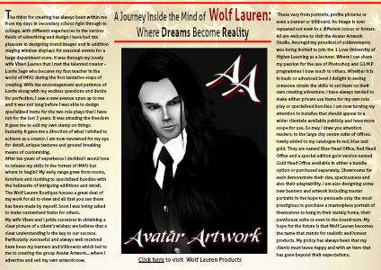 These vary from portraits, profile pictures or even a banner or billboard. No image is ever repeated not even in a different colour or format. All are welcome to visit the Avatar Artwork Studio. Amongst my proudest of achievements was being invited to join the 1 Love University of Higher Learning as a lecturer. Where I can share my passion for the use of Photoshop and G.I.M.P programmes I now teach to others. Whether it is in basic or advanced level I delight in seeing someone obtain the skills to set them on their own creating adventure. I have always tended to make either private use items for my own role play or specialised bundles. I am now turning my attention to bundles that should appeal to a wider clientele available publicly and have more scope for use. So may I draw you attention readers, to the large city centre suite of offices, newly added to my catalogue in red, blue and gold. They are named Blue Head Office, Red Head Office and a special edition gold version named Gold Head Office available in either a bundle option or purchased separately. Showrooms for each demonstrate their size, spaciousness and also their adaptability. I am also designing some new banners and artwork including master portraits in the hope to persuade only the most prestigious to purchase a masterpiece portrait of themselves to hang in their stately home, their penthouse suite or even in the boardroom. My hope for the future is that Wolf Lauren becomes the name that stands for realistic and honest products. My policy has always been that my clients must leave happy and with an item that has gone beyond their expectations.