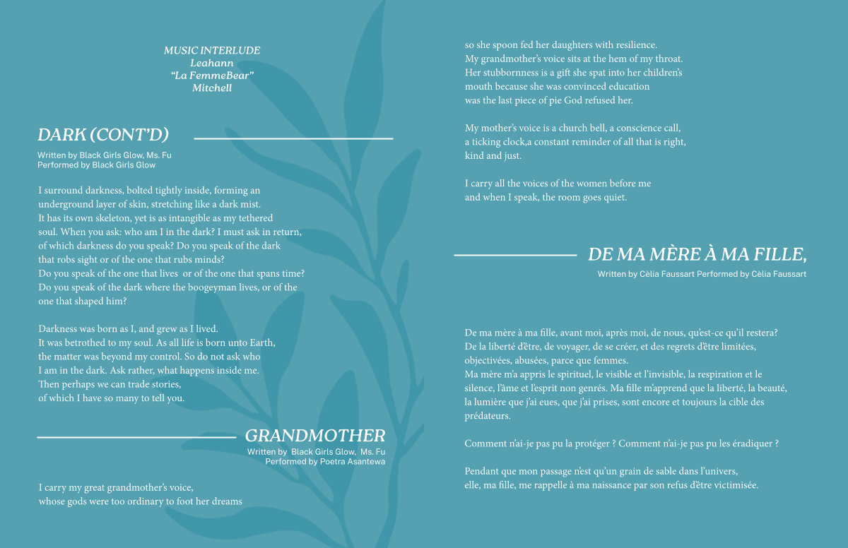 so she spoon fed her daughters with resilience. My grandmother’ s voice sits at the hem of my throat. Her stubbornness is a gift she spat into her children’ s mouth because she was convinced education was the last piece of pie God refused her.