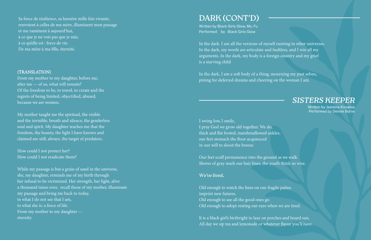In the dark. I am all the versions of myself existing in other universes. In the dark, my words are articulate and faultless, and I win all my arguments. In the dark, my body is a foreign country and my grief is a starving child
