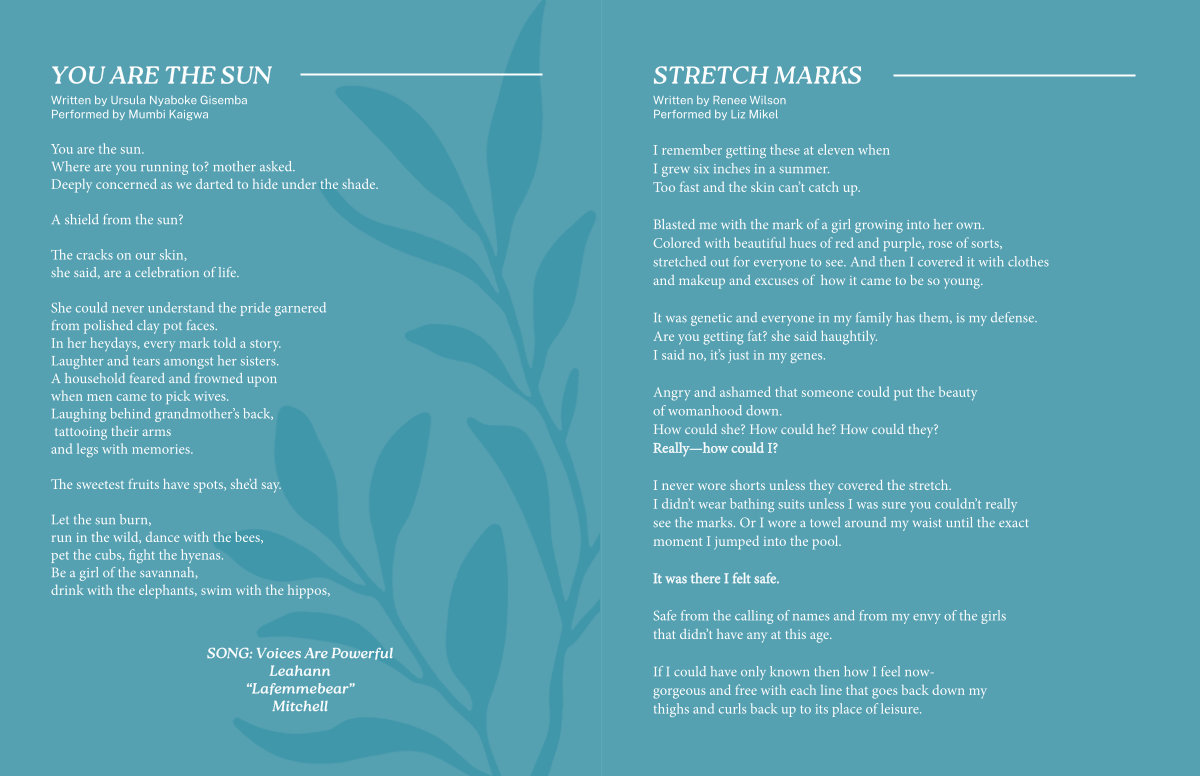 Blasted me with the mark of a girl growing into her own. Colored with beautiful hues of red and purple, rose of sorts, stretched out for everyone to see. And then I covered it with clothes and makeup and excuses of how it came to be so young.