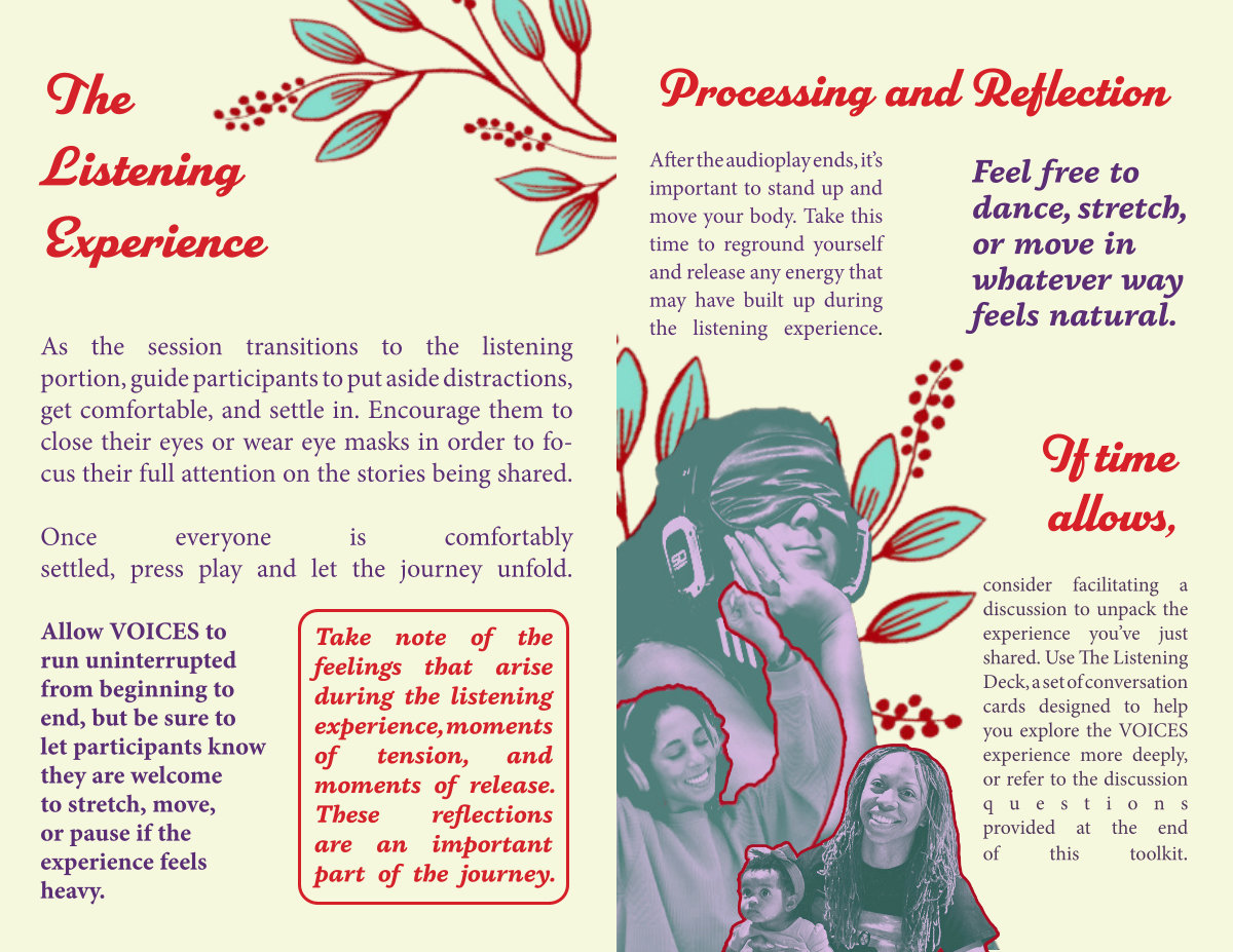 consider facilitating a discussion to unpack the experience you’ ve just shared. Use The Listening Deck, a set of conversation cards designed to help you explore the VOICES experience more deeply, or refer to the discussion q u e s t i o n s provided at the end of this toolkit.