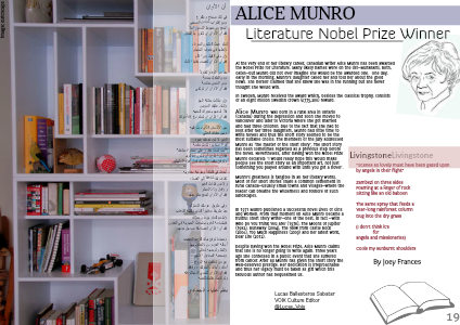 At the very end of her literary career, Canadian writer Alice Munro has been awarded the Nobel Prize for Literature. Many likely names were on the list—Murakami, Roth, Oates—but Munro did not ever imagine she would be the awarded one. One day, early in the morning, Munro’s daughter called her and told her about the good news. She herself claimed that she knew she was in the running but she never thought she would win.