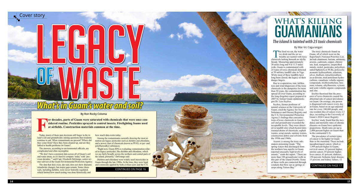 The food we eat, the water we drink and the air we breathe are tainted with toxic chemicals lurking beneath an idyllic facade. Measuring approximately 30 miles long and 4 to 11.5 miles wide, Guam is contaminated with 25 types of toxic chemicals detected at 39 military landfill sites in Yigo. While most of these landfills have long been closed, the legacy of their danger lingers.