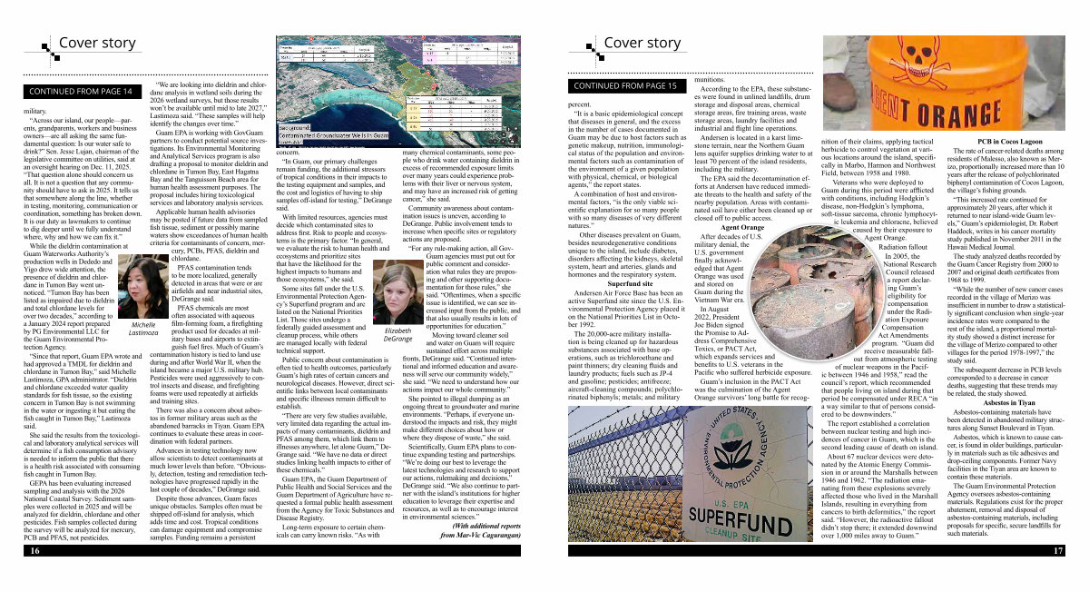 “ There are very few studies available, very limited data regarding the actual impacts of many contaminants, dieldrin and PFAS among them, which link them to illnesses anywhere, let alone Guam,” De- Grange said.“ We have no data or direct studies linking health impacts to either of these chemicals.”