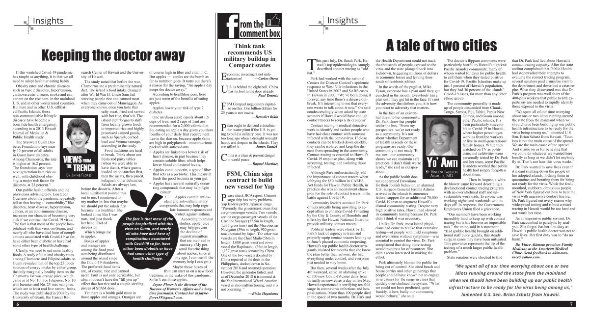 Our public health officials and the physicians advising Gov . Lou Leon Guerrero about the pandemic repeatedly tell us that having a “ comorbidity ” like diabetes , heart disease , hypertension , cancer , or an auto-immune disease , increases our chances of becoming very sick if we contract the Covid-19 virus . The fact is that most of the people hospitalized with this virus on Guam , and nearly all who have died here of complications associated with Covid-19 so far , have either been diabetic or have had some other type of health challenge .