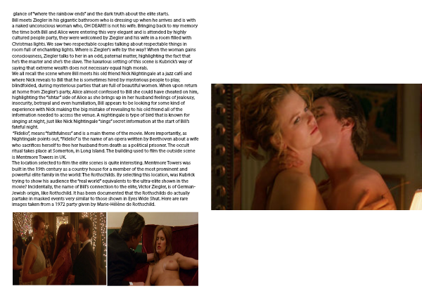 “Fidelio”, means “faithfulness” and is a main theme of the movie. More importantly, as Nightingale points out, “Fidelio” is the name of an opera written by Beethoven about a wife who sacrifices herself to free her husband from death as a political prisoner. The occult ritual takes place at Somerton, in Long Island. The building used to film the outside scene is Mentmore Towers in UK.