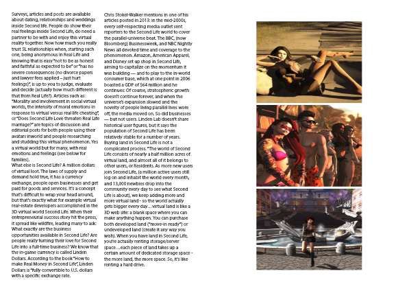 Chris Stokel-Walker mentions in one of his articles posted in 2013: in the mid-2000s, every self-respecting media outlet sent reporters to the Second Life world to cover the parallel-universe beat. The BBC, (now Bloomberg) Businessweek, and NBC Nightly News all devoted time and coverage to the phenomenon. Amazon, American Apparel, and Disney set up shop in Second Life, aiming to capitalize on the momentum it was building — and to play to the in-world consumer base, which at one point in 2006 boasted a GDP of $64 million and he continues: Of course, stratospheric growth doesn’t continue forever, and when the universe’s expansion slowed and the novelty of people living parallel lives wore off, the media moved on. So did businesses — but not users. Linden Lab doesn’t share historical user figures, but it says the population of Second Life has been relatively stable for a number of years.