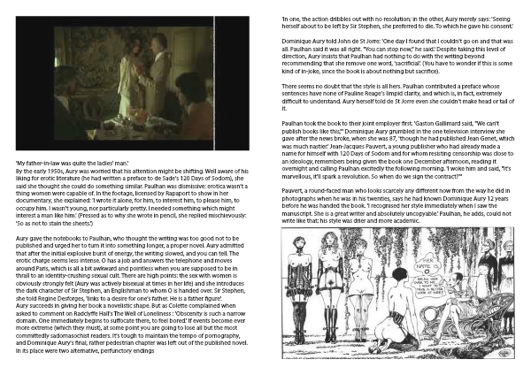 There seems no doubt that the style is all hers. Paulhan contributed a preface whose sentences have none of Pauline Reage's limpid clarity, and which is, in fact, extremely difficult to understand. Aury herself told de St Jorre even she couldn't make head or tail of it.