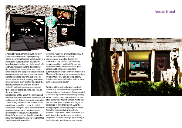 I started by asking them about how they came to Austin Island. Sage replied by telling me she had learned about Austin at a submissive support group. "I had never heard of Austin before, so I did a search of it and was curious about the description. I decided one day to go to the sim. I really loved the sim and the people at Austin and have been here ever since." she continued. Dakota described how she had come to Austin by chance after noticing a Story of O sim is someone else's profile. "I noticed the training component to it and it sort of clicked. I had had someone recommend that I explore training before, you see...so the stars aligned."