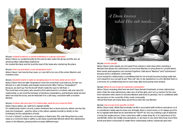 Alvise Cliassi: well, I think that normally our life is associated with violence and abuse or, it is considered a kinky way for have sex. Actually, there is much more, so it's always good to try to explain well what we do and what we *don't* do. You see, training a girl, it depends a lot by the single person. Some come here, with a really deep RL or SL experience in D/s and BDSM, others are totally new and green, so we have to see every time how much they know and what is important to make them understand, before somebody gets hurt