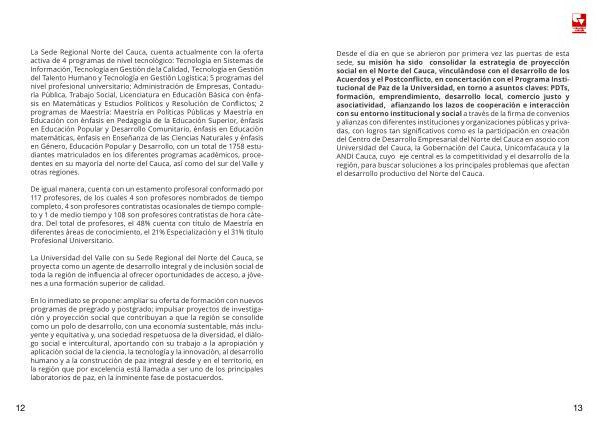 Desde el día en que se abrieron por primera vez las puertas de esta sede , su misión ha sido consolidar la estrategia de proyección social en el Norte del Cauca , vinculándose con el desarrollo de los Acuerdos y el Postconflicto , en concertación con el Programa Institucional de Paz de la Universidad , en torno a asuntos claves : PDTs , formación , emprendimiento , desarrollo local , comercio justo y asociatividad , afianzando los lazos de cooperación e interacción con su entorno institucional y social a través de la firma de convenios y alianzas con diferentes instituciones y organizaciones públicas y privadas , con logros tan significativos como es la participación en creación del Centro de Desarrollo Empresarial del Norte del Cauca en asocio con Universidad del Cauca , la Gobernación del Cauca , Unicomfacauca y la ANDI Cauca , cuyo eje central es la competitividad y el desarrollo de la región , para buscar soluciones a los principales problemas que afectan el desarrollo productivo del Norte del Cauca .