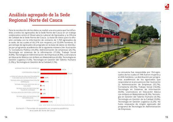 La encuesta fue respondida por 154 egresados de los cuales el 74 % fueron mujeres y el 26 % hombres . La distribución por programas académicos de los egresados que respondieron la encuesta es ( Ver Ilustración 2 ): Administración de Empresas ( 35,7 %), Contaduría ( 20,4 %), Trabajo Social ( 14,6 %), Tecnología en Sistemas de Información ( 9,6 %), Licenciatura en Educación Básica con énfasis en Matemáticas ( 8,3 %), Tecnología en Gestión del Talento Humano ( 4,5 %), Tecnología en Gestión de la Calidad ( 3,8 %), Tecnología en Gestión Logística ( 3,2 %). No hubo respuesta de ningún egresado del programa de Tecnología en Administración de Empresas .
