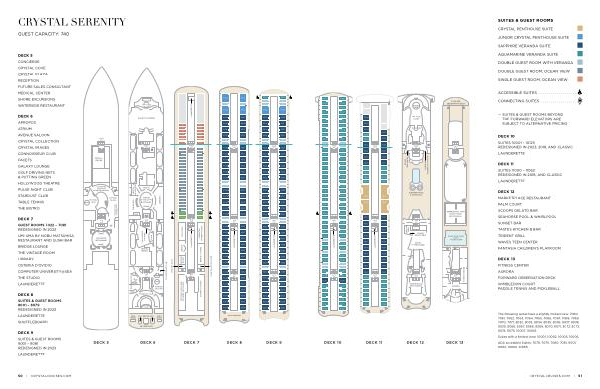 SUITES & GUEST ROOMS CRYSTAL PENTHOUSE SUITE JUNIOR CRYSTAL PENTHOUSE SUITE SAPPHIRE VERANDA SUITE AQUAMARINE VERANDA SUITE DOUBLE GUEST ROOM WITH VERANDA DOUBLE GUEST ROOM , OCEAN VIEW SINGLE GUEST ROOM , OCEAN VIEW ACCESSIBLE SUITES .................... CONNECTING SUITES . .................. — SUITES & GUEST ROOMS BEYOND THE FORWARD ELEVATORS ARE SUBJECT TO ALTERNATIVE PRICING DECK 10 DECK 12 DECK 11 DECK 13 DECK 10 SUITES 10001 – 10125 REDESIGNED IN 2023 , 2018 , AND CLASSIC LAUNDERETTE DECK 11 SUITES 11000 – 11062 REDESIGNED IN 2018 , AND CLASSIC LAUNDERETTE DECK 12 MARKETPLACE RESTAURANT PALM COURT SCOOPS GELATO BAR SEAHORSE POOL & WHIRLPOOL SUNSET BAR TASTES KITCHEN & BAR TRIDENT GRILL WAVES TEEN CENTER FANTASIA CHILDREN ’ S PLAYROOM DECK 13 FITNESS CENTER AURŌRA FORWARD OBSERVATION DECK WIMBLEDON COURT PADDLE TENNIS AND PICKLEBALL The following suites have a slightly limited view : 7060 , 7061 , 7062 , 7063 , 7064 , 7065 , 7066 , 7067 , 7068 , 7069 , 7070 , 7071 , 8032 , 8033 , 8034 , 8035 , 8036 , 8037 , 8038 , 8039 , 8066 , 8067 , 8068 , 8069 , 8070 , 8071 , 8072 , 8073 , 8074 , 8075 , 10007 , 10008 . Suites with a limited view : 10001 , 10002 , 10005 , 10006 . ADA accessible Suites : 7078 , 7079 , 7080 , 7081 , 9001 , 9002 , 10064 , 10065 . 10037 10039 10041 10043 10045 10047 10049 10051 10053 10055 10057 10059 10061 10063 10065 10067 10107 10111 10115 10119 10121 10125 10069 10071 10073 10075 10001 10005 10007 10011 10015 10019 10021 10025 10027 10031 10077 10079 10083 10087 10091 10097 10101 10085 10033 10035 10036 10038 10040 10042 10044 10046 10048 10050 10002 10006 10008 10012 10014 10018 10020 10024 10026 10030 10032 10034 10093 10095 10052 10054 10056 10058 10060 10062 10064 10066 10068 10070 10072 10074 10076 10078 10082 10086 10090 10084 10092 10094 10105 10106 10110 10112 10116 10118 10122 10096 10100 10104 LAUNDERETTE FWD ELV AFT ELV MID ELV 11001 11003 11005 11007 11000 11002 11010 11012 11009 11011 11014 11016 11029 11031 11032 11027 11030 11034 11033 11035 11036 11038 11004 11037 11040 11042 11041 11039 11043 11044 11046 11045 11048 11051 11053 11047 11050 11049 11052 11019 11022 11021 11024 11023 11026 11025 11028 11015 11018 11017 11020 11006 11008 11055 11057 11059 11054 11056 11058 11060 11062 LAUNDERETTE FWD ELV AFT ELV MID ELV SEAHORSE POOL & WHIRLPOOL FANTASIA CHILDREN ’ S PLAYROOM WAVES TEEN CENTER THE PALM COURT SUNSET BAR TEA ROOM L G L G TRIDENT GRILL TASTES KITCHEN & BAR SCOOPS GELATO BAR MARKETPLACE RESTAURANT FWD ELV AFT ELV MID ELV GLASS ROOF OVER TASTES KITCHEN & BAR FORWARD OBSERVATION DECK L G WIMBLEDON COURT PADDLE TENNIS AND PICKLEBALL FITNESS CENTER FWD ELV AFT ELV CRYSTALCRUISES . COM | 51