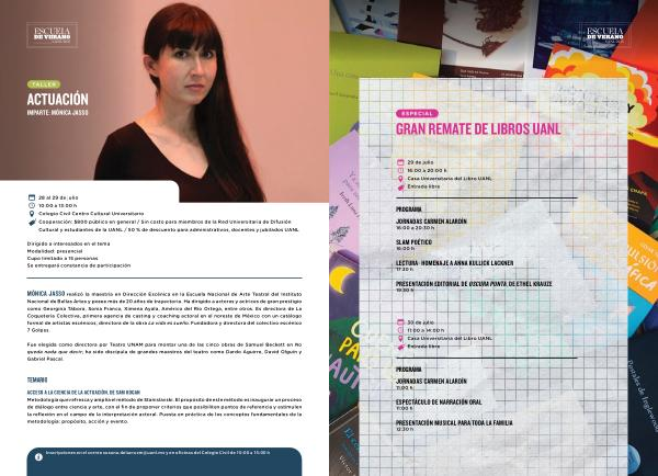 28 al 29 de julio 10:00 a 13:00 h Colegio Civil Centro Cultural Universitario Cooperación : $ 800 público en general / Sin costo para miembros de la Red Universitaria de Difusión Cultural y estudiantes de la UANL / 50 % de descuento para administrativos , docentes y jubilados UANL