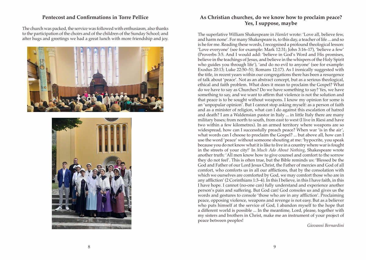 The superlative William Shakespeare in Hamlet wrote:‘ Love all, believe few, and harm none’. For many Shakespeare is, to this day, a teacher of life... and so is he for me. Reading these words, I recognised a profound theological lesson:‘ Love everyone’( see for example: Mark 12:31; John 3:16 – 17),‘ believe a few’( Proverbs 3:5. And I would add:‘ believe in God’ s Word and His promises, believe in the teachings of Jesus, and believe in the whispers of the Holy Spirit who guides you through life’),‘ and do no evil to anyone’( see for example: Exodus 20:13; Luke 22:50 – 51; Romans 12:17). As I ironically suggested with the title, in recent years within our congregations there has been a resurgence of talk about‘ peace’. Not as an abstract concept, but as a serious theological, ethical and faith problem. What does it mean to proclaim the Gospel? What do we have to say as Churches? Do we have something to say? Yes, we have something to say, and we want to affirm that violence is not the solution and that peace is to be sought without weapons. I know my opinion for some is an‘ unpopular opinion’. But I cannot stop asking myself: as a person of faith and as a minister of religion, what can I do against this escalation of hatred and death? I am a Waldensian pastor in Italy... in little Italy there are many military bases; from north to south, from east to west( I live in Riesi and have two within a few kilometres). In an armed territory where weapons are so widespread, how can I successfully preach peace? When war‘ is in the air’, what words can I choose to proclaim the Gospel?... but above all, how can I use the word‘ peace’ without someone shouting at me:‘ hypocrite, you speak because you do not know what it is like to live in a country where war is fought in the streets of your city!’ In Much Ado About Nothing, Shakespeare wrote another truth:‘ All men know how to give counsel and comfort to the sorrow they do not feel’. This is often true, but the Bible reminds us:‘ Blessed be the God and Father of our Lord Jesus Christ, the Father of mercies and God of all comfort, who comforts us in all our afflictions, that by the consolation with which we ourselves are comforted by God, we may comfort those who are in any affliction’( 2 Corinthians 1:3 – 4). In this I believe, in this I have faith, in this I have hope. I cannot( no-one can) fully understand and experience another person’ s pain and suffering. But God can! God consoles us and gives us the words and gestures to console‘ those who are in any affliction’. Proclaiming peace, opposing violence, weapons and revenge is not easy. But as a believer who puts himself at the service of God, I abandon myself to the hope that a different world is possible... In the meantime, Lord, please, together with my sisters and brothers in Christ, make me an instrument of your project of peace between peoples!