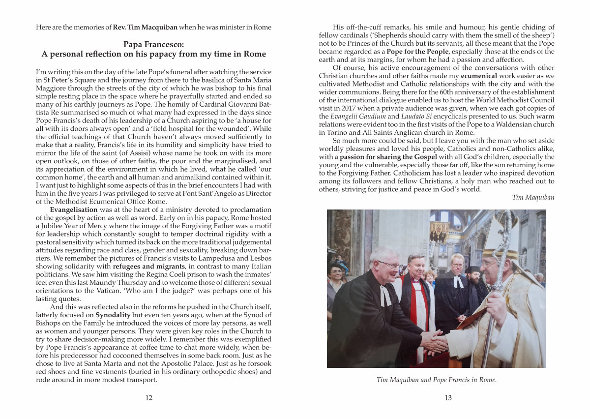 I’ m writing this on the day of the late Pope’ s funeral after watching the service in St Peter’ s Square and the journey from there to the basilica of Santa Maria Maggiore through the streets of the city of which he was bishop to his final simple resting place in the space where he prayerfully started and ended so many of his earthly journeys as Pope. The homily of Cardinal Giovanni Battista Re summarised so much of what many had expressed in the days since Pope Francis’ s death of his leadership of a Church aspiring to be‘ a house for all with its doors always open’ and a‘ field hospital for the wounded’. While the official teachings of that Church haven’ t always moved sufficiently to make that a reality, Francis’ s life in its humility and simplicity have tried to mirror the life of the saint( of Assisi) whose name he took on with its more open outlook, on those of other faiths, the poor and the marginalised, and its appreciation of the environment in which he lived, what he called‘ our common home’, the earth and all human and animalkind contained within it. I want just to highlight some aspects of this in the brief encounters I had with him in the five years I was privileged to serve at Pont Sant’ Angelo as Director of the Methodist Ecumenical Office Rome.