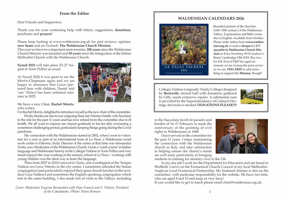 Please keep looking at www. waldensian. org. uk for past reviews, updates, new items and on Facebook: The Waldensian Church Mission. This year we have two important anniversaries: 200 years since the Waldensian Church Mission was founded and 50 years since the Integration of the Italian Methodist Church with the Waldensian Church.