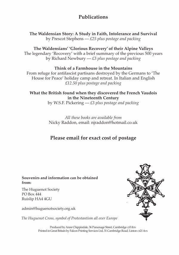 The Waldensians’‘ Glorious Recovery’ of their Alpine Valleys The legendary‘ Recovery’ with a brief summary of the previous 500 years by Richard Newbury— £ 3 plus postage and packing